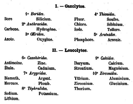 Des études géologiques, m’ont conduit pour l’achèvement d’un mémoire de lithologie en cours de rédaction, à un classement naturel des corps simples ou radicaux par un système graphiquement hélicoïdal, reposant sur l’emploi de nombres que j’appelle nombres caractéristiques ou caractères numériques (Chancourtois, La vis tellurique).