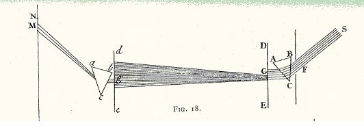 Ayant introduit dans ma chambre obscure un gros faisceau de rayons solaires, par un trou fait au volet, je le fis tomber sur un prisme peu distant ABC, de manière à projetter le spectre au fond de la chambre. Proche de ce prisme j’élevai verticalement une planche mince DE, percée en G d’un trou rond de quatre lignes, afin de transmettre une partie de la lumière réfractée. Ensuite, environ à 12 pieds de cette planche, j’en élevai une autre de percée en g d’un pareil trou, afin de ne donner passage qu’à une partie de la lumière incidente. Immédiatement après le dernier trou, je fixai un second prisme abc pour réfracter les rayons transmis. Alors je revins promptement au premier : et le tournant peu à peu sur son axe, je fis monter et descendre l’image projetée sur la seconde planche ; en sorte que les rayons de toutes ses parties pouvaient passer successivement par le trou de cette planche, et tomber sur le prisme qui était derrière : en même temps je marquai sur le mur opposé les endroits MN où tombait chaque espèce de rayons, après avoir été réfractés par le second prisme ; et tandis que le premier tournait sur son axe, je remarquai que ces endroits placés au-dessus l’un de l’autre changeaient sans cesse. Par leurs hauteurs respectives, je trouvai constamment que les rayons violets, qui avaient souffert la plus grande réfraction dans le premier prisme, souffraient aussi la plus grande réfraction dans le second prisme ; et ainsi des autres espèces …