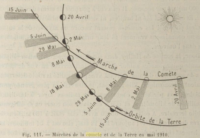 « La question qui nous intéresse le plus et qui, vraiment, parait passionner, en ce moment une partie notable de l’humanité entière, c’est de savoir ce qui peut résulter de cette position de la comète par rapport à nous. Il n’est pas douteux, en effet, que si la queue cométaire est rectiligne et opposée au Soleil, et si elle a des dimensions normales, elle doit nous atteindre et nous dépasser, de sorte que le globe terrestre tout entier doit y être immergé pendant plusieurs heures. »
