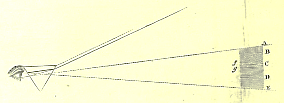 La ligne A qui limite le côté rouge du spectre est difficile à voir. La ligne B, entre le rouge et le vert, dans une certaine position du prisme, est parfaitement distincte; Il en est de même pour D et E, les deux limites du violet. Mais C, la limite du vert et du bleu, n’est pas aussi clairement marquée que le reste; et il y a aussi, de chaque côté de cette limite, d’autres lignes noires distinctes, f et g, qui, dans une expérience imparfaite, pourraient être confondues avec la limite de ces couleurs.