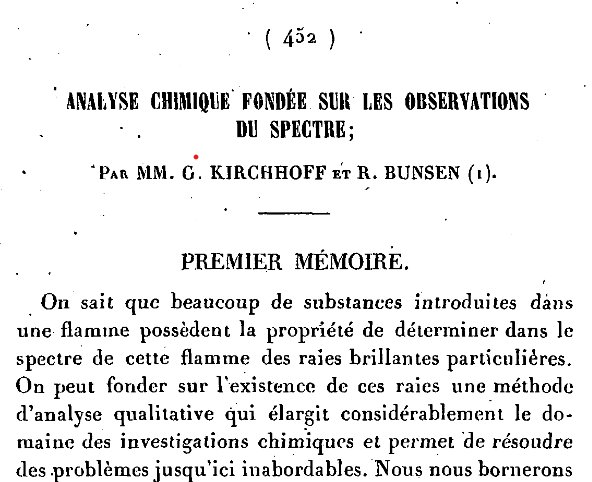 Kirchhoff Gustav, Bunsen Robert, Analyse chimique fondée sur les observations du spectre, Annales de Chimie et de Physique, 3, LXII (1861) : 452-486 et 3, LXIV (1862) : 257-311.