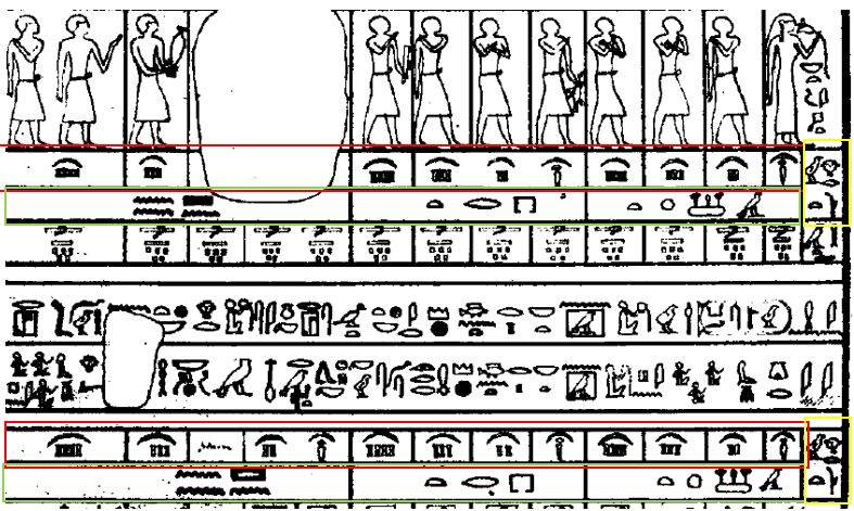 En 1906, l’égyptologue Breasted, identifie que chaque mois, le prieuré d’Hathor est géré par une personne différente et que les jours épagomènes ainsi que le premier mois sont présidés par la femme de Nekonekh, Hezethekenu, confidente du roi Userkaf. En dessous du nom des saisons, Fraser identifie des noms de lieux. Pour ce qui nous intéresse, on retrouve là trois saisons de quatre mois. Toute à droite, et donc en début d’année, on a un rectangle à part, qui correspond aux jours épagomènes. On lit ensuite de droite à gauche, la première saison, Akhet (inondation), puis Peret (émergence des Terres) et enfin Shemou (eaux basses).