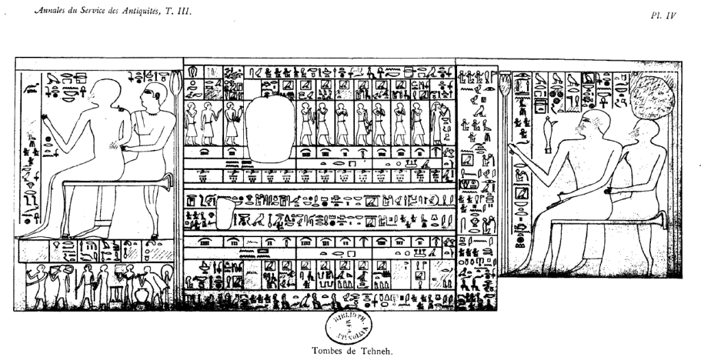 Au-dessus des mois, on trouve tout à droite, en premier, une femme respirant une fleur, c’est la femme du cousin du roi Userkaf, Hezethekenu, qui était prêtresse de la déesse Hathor, elle est suivie (sur la gauche) par des prêtres, qui sont aussi ses fils.