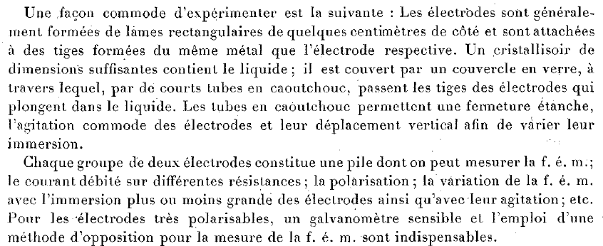 « A titre d’exemple : Une pile formée d’électrodes en platine platiné noir et en graphite Acheson, plongeant clans une solution saturée de soude, a une f.é.m. de 0,450 volt. En extrayant l’air, la f.é.m. baisse graduellement, arrive au bout de 3 mois à 0,001 volt et se maintient à cette valeur pendant 6 mois, au bout desquels on laisse entrer l’air; la f.é.m. remonte en quelques minutes à 0,100 volt et dans les 10 jours suivants à 0,450 volt, valeur à laquelle elle se maintient. »