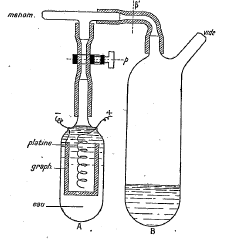 « A titre d’exemple : Une pile formée d’électrodes en platine platiné noir et en graphite Acheson, plongeant clans une solution saturée de soude, a une f.é.m. de 0,450 volt. En extrayant l’air, la f.é.m. baisse graduellement, arrive au bout de 3 mois à 0,001 volt et se maintient à cette valeur pendant 6 mois, au bout desquels on laisse entrer l’air; la f.é.m. remonte en quelques minutes à 0,100 volt et dans les 10 jours suivants à 0,450 volt, valeur à laquelle elle se maintient. »