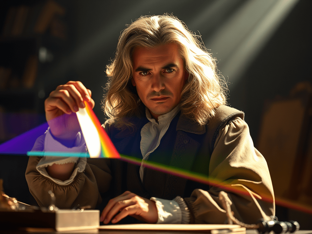 Au cours des années 1670 à 1672, Newton étudie la réfraction de la lumière et démontre qu’un prisme décompose la lumière blanche en un spectre de couleurs, et qu’un objectif avec un deuxième prisme recompose le spectre multicolore en lumière blanche.